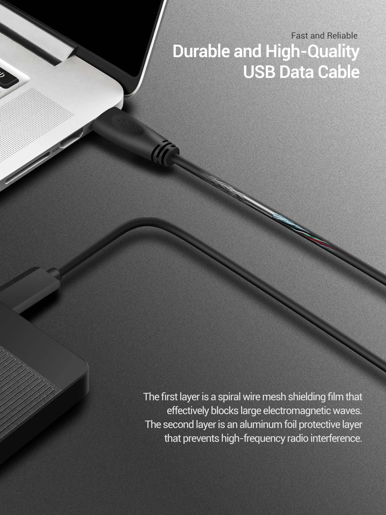 The USB cable features spiral mesh and aluminum foil dual shielding for stable, interference-free transmission.